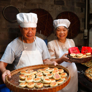 9月25日,在安徽省黃山市休寧縣萬安老街,制餅手藝人程貴生(左)和妻子祝桂花展示制作好的“徽式麻仁月餅”。新華社發(施亞磊 攝)
