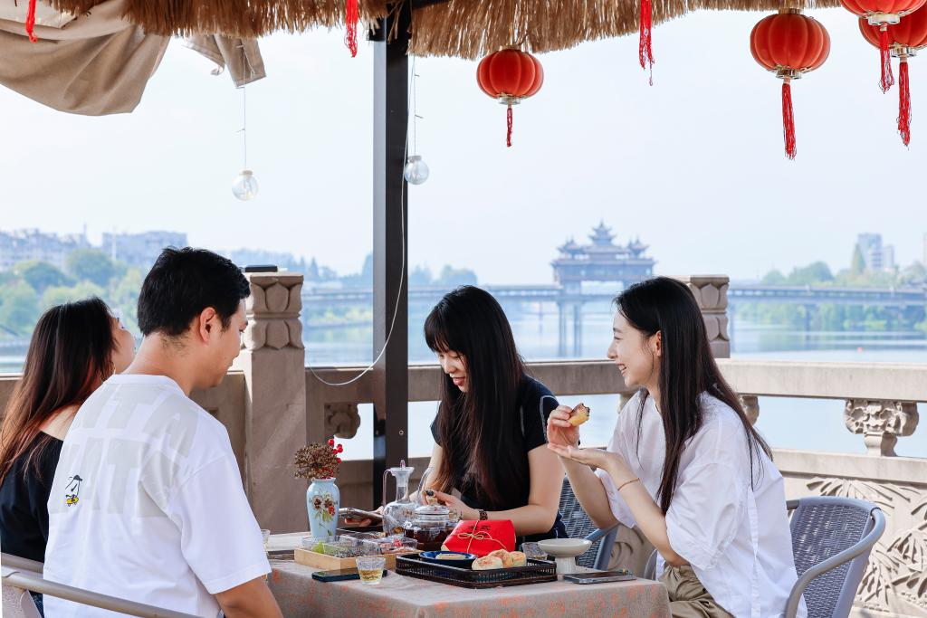 9月29日,市民在安徽省黃山市屯溪區品嘗“徽式麻仁月餅”。新華社發(施亞磊 攝)