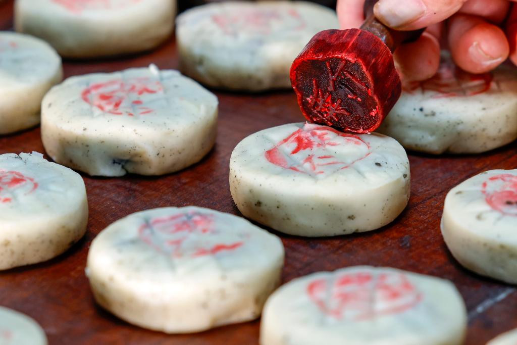 9月25日,在安徽省黃山市休寧縣萬安老街,制餅手藝人程貴生在給月餅蓋印。新華社發(施亞磊 攝)