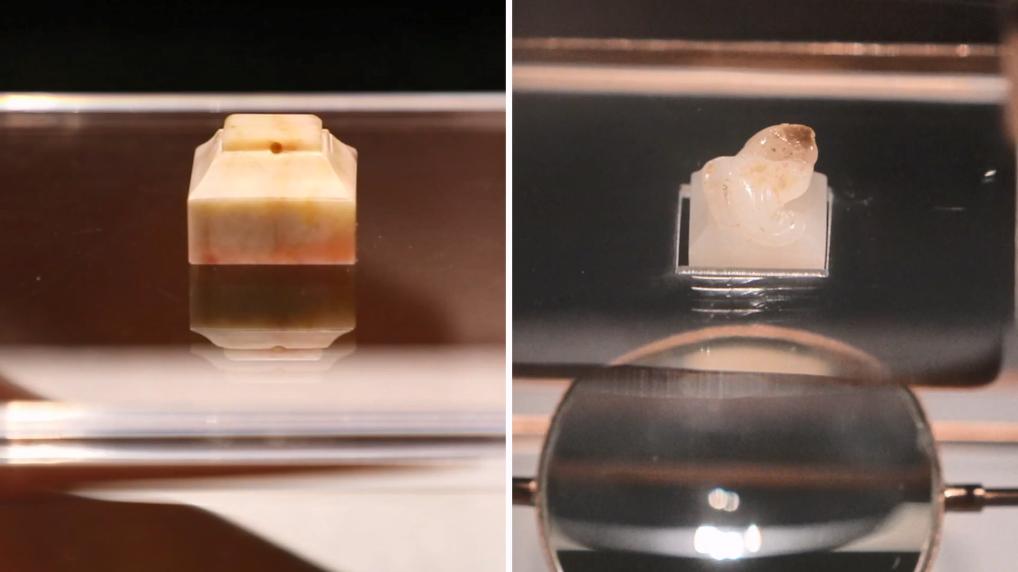 拼版圖片:左圖為西漢“趙眜”覆斗紐玉?。◤椭破罚?,右圖為“劉賀”螭紐玉印。新華社記者 袁慧晶 攝