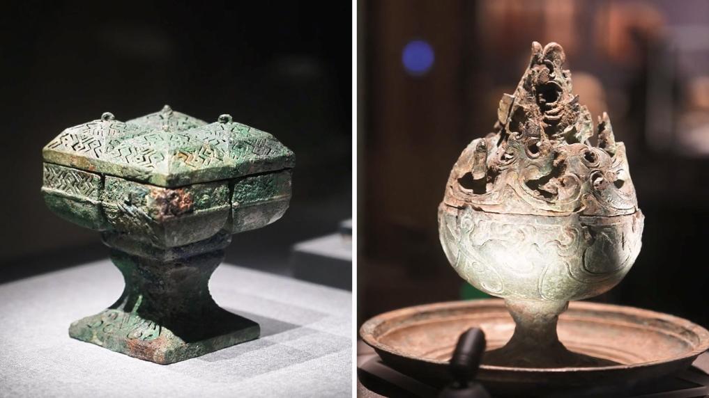 拼版圖片:左圖為趙眜墓出土的四連體銅熏爐,右圖為劉賀墓出土的博山爐。新華社記者 袁慧晶 攝