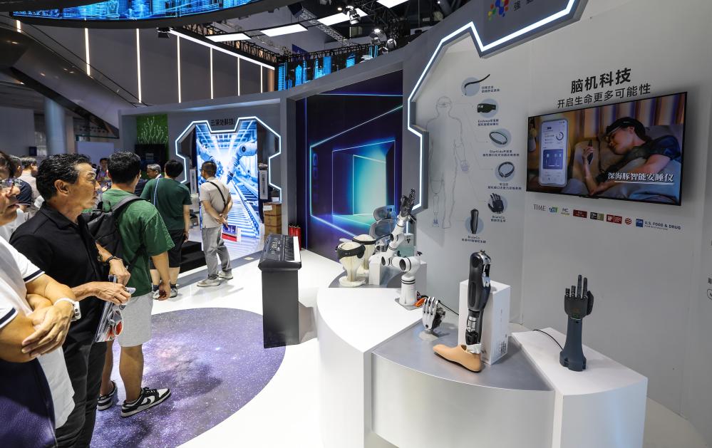 9月25日,在第四屆全球數字貿易博覽會數智未來主題展區的杭州六小龍專區,觀眾在觀看強腦科技的智能仿生手。新華社記者 徐昱 攝