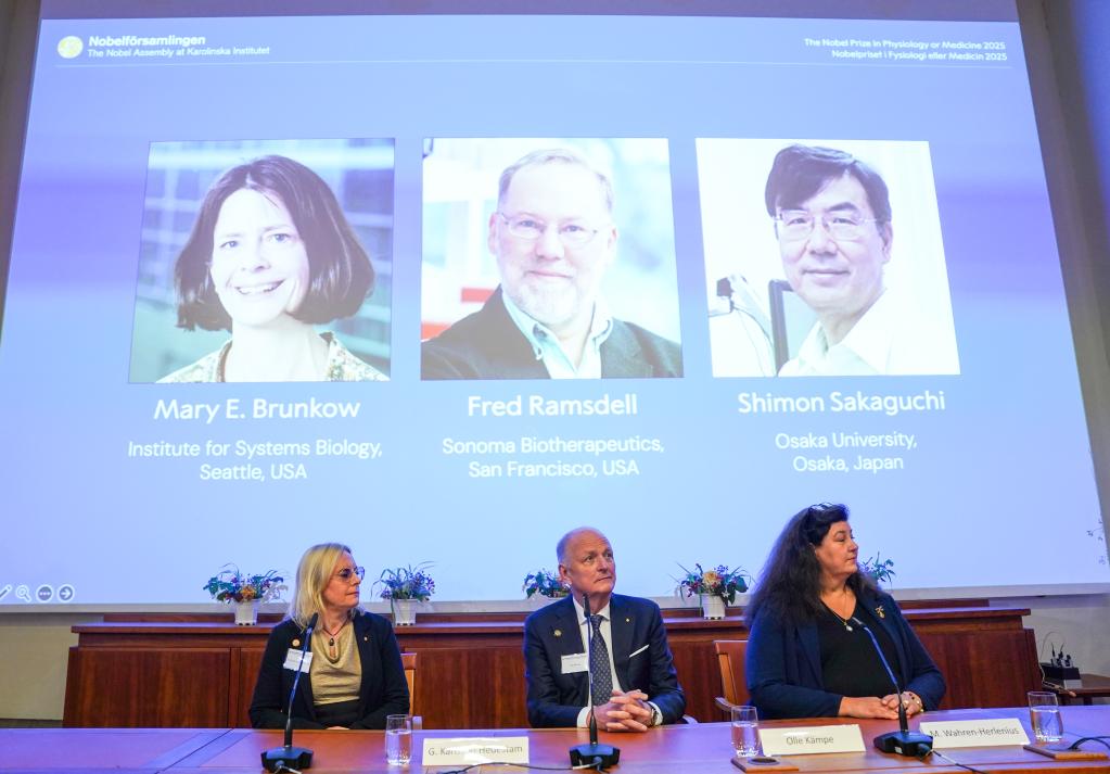 10月6日,在瑞典斯德哥爾摩舉行的2025年諾貝爾生理學或醫學獎公布現場,三名獲獎科學家的照片和名字顯示在大屏幕上。新華社記者 彭子洋 攝