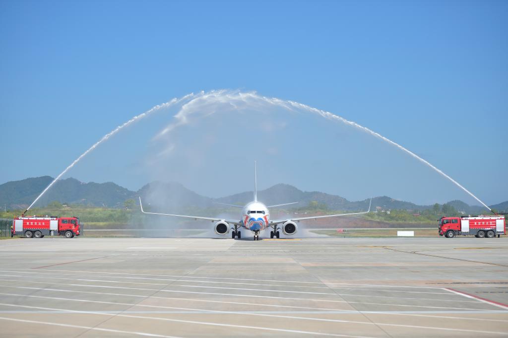 2025年9月28日,由中國國際航空執飛的北京大興至瑞金航班飛抵瑞金機場后通過“水門”。新華社發(楊鑫 攝)
