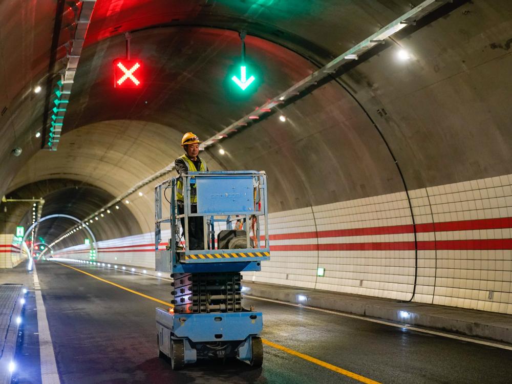 2025年9月28日,中鐵十一局的工人在四川夾金山隧道內進行收尾巡查施工。新華社記者 王曦 攝