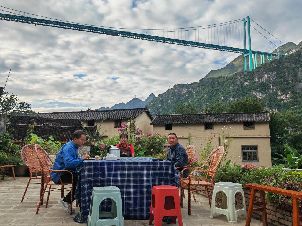 2025年9月27日,在貴州花江峽谷大橋附近,林國權(左)在自家民宿和員工坐在一起交流。新華社記者 向定杰 攝