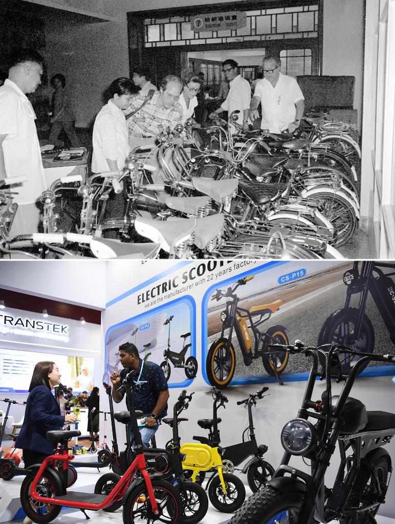 拼版照片,上圖為:美國客商在1981年秋季中國出口商品交易會上選購自行車。(新華社記者黃鑒秋攝,1981年10月24日發);下圖為2023年4月15日,采購商(右)和電動自行車參展商在第133屆廣交會上交流。(新華社記者鄧華攝)