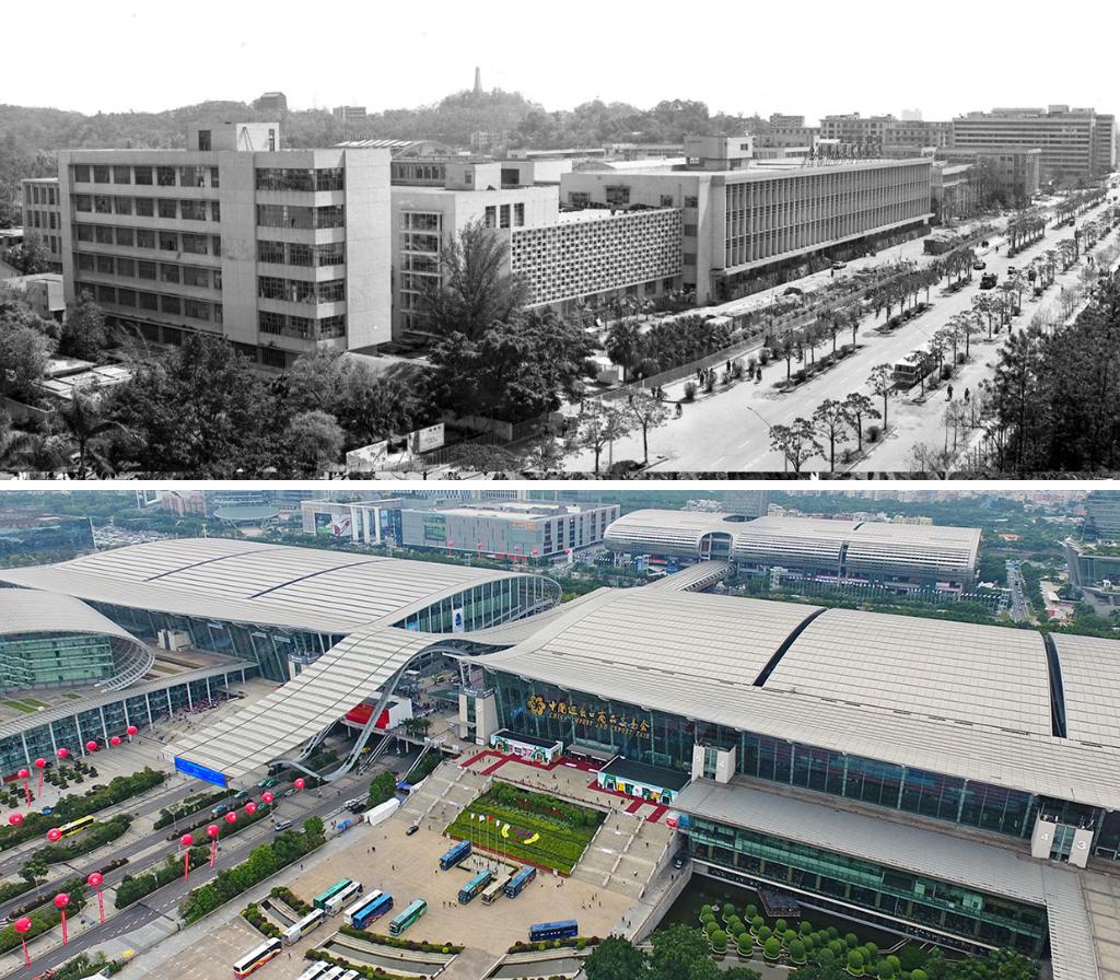拼版照片,上圖為:中國出口商品交易會原會址:流花湖畔的廣州對外貿易中心。(新華社記者黃鑒秋攝,1980年4月4日發);下圖為:2018年11月1日,無人機拍攝的第124屆廣交會現場。從2003年起,廣交會逐步遷往新址——廣州琶洲會展中心。(新華社記者梁旭攝)
