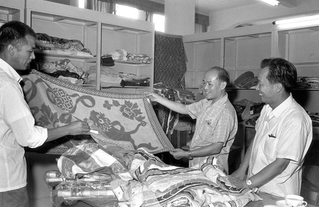 1977年秋季中國出口商品交易會10月15日在廣州開幕。港澳客商在選購河南生產的獅子戲繡球浴巾。