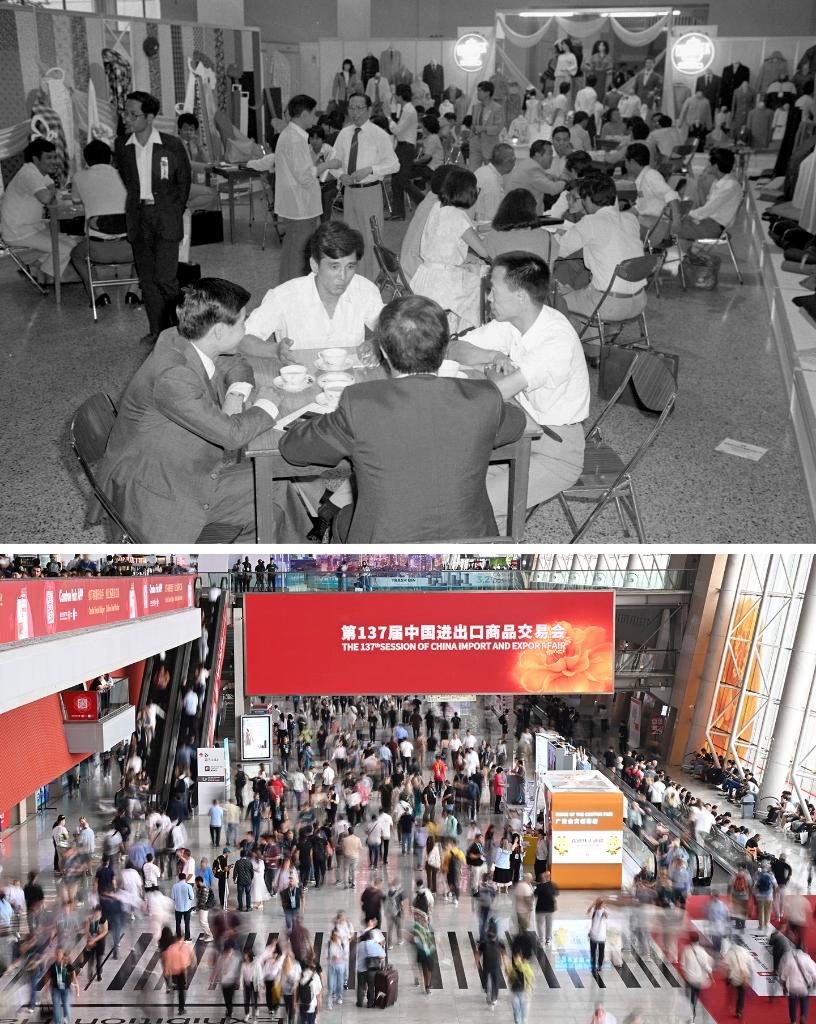 拼版照片,上圖為:1984年秋季中國出口商品交易會1984年10月15日在廣州開幕。來自世界各地的5900多位客商出席了開幕式。這是紡織品交易洽談活動正熱烈地進行(新華社記者黃鑒秋攝,1984年10月30日發);下圖為:2025年4月23日拍攝的第137屆廣交會二期現場。到會境外采購商人數和現場意向出口成交等多項指標刷新歷史紀錄。截至5月4日,共有來自219個國家和地區的28.89萬名境外采購商到會(新華社記者鄧華攝)