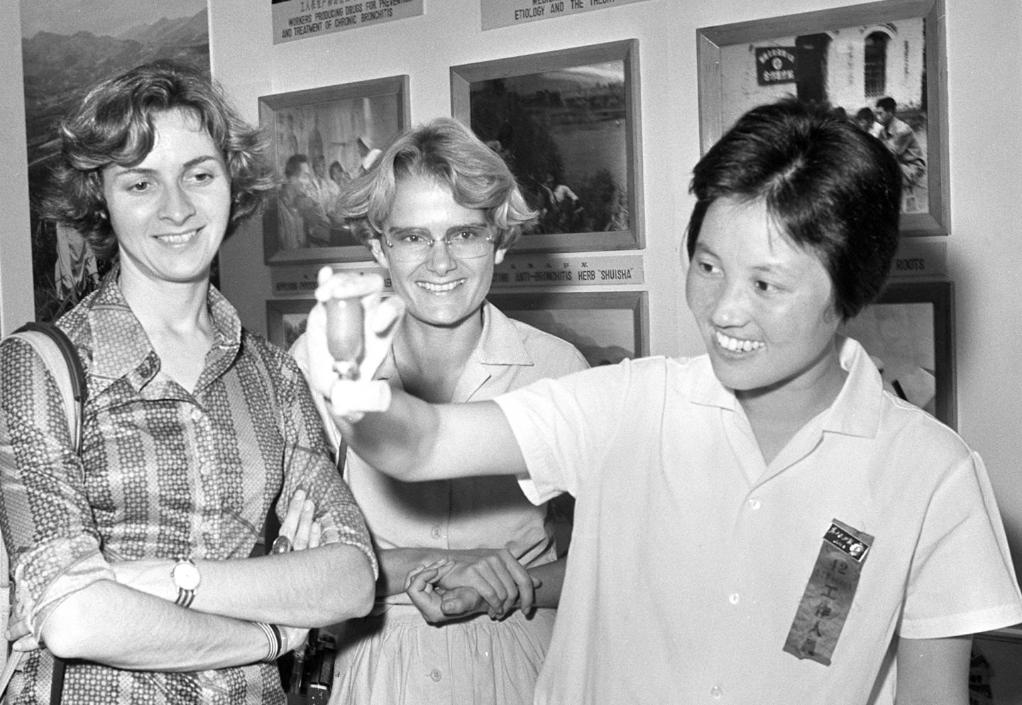 1977年秋季中國出口商品交易會上,交易會醫療衛生館介紹的河南省防治慢性支氣管炎的先進經驗吸引了各國來賓。這是工作人員正在示范如何使用熱參噴劑。