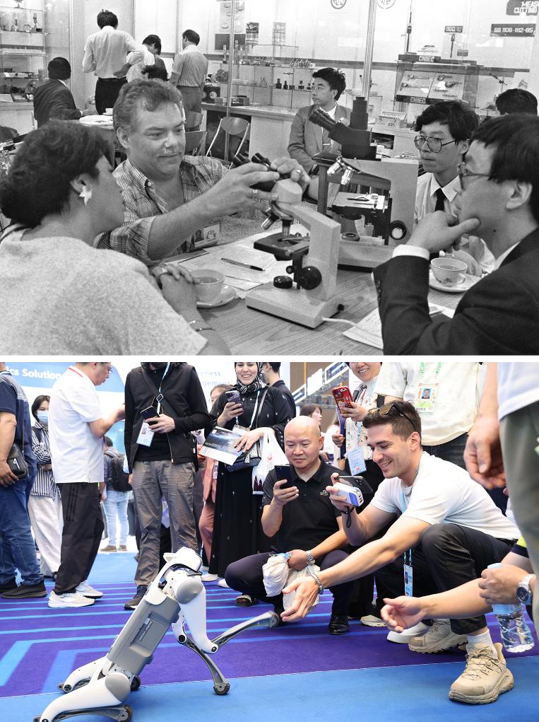 拼版照片,上圖為:1990年10月15日,第68屆中國出口商品交易會在廣州開幕。中國儀器進出口總公司的產品大都是中國自行研制生產,其技術水平均居國內領先地位,其中一些產品還達到甚至超過了國際先進水平。這是美國客商在選購顯微鏡(新華社記者黃鑒秋攝);下圖為:2025年4月15日在第137屆廣交會服務機器人專區,客商跟機器人互動。4月15日至19日舉行的廣交會第一期以“先進制造”為主題,首次增設服務機器人專區。(新華社記者盧漢欣攝)