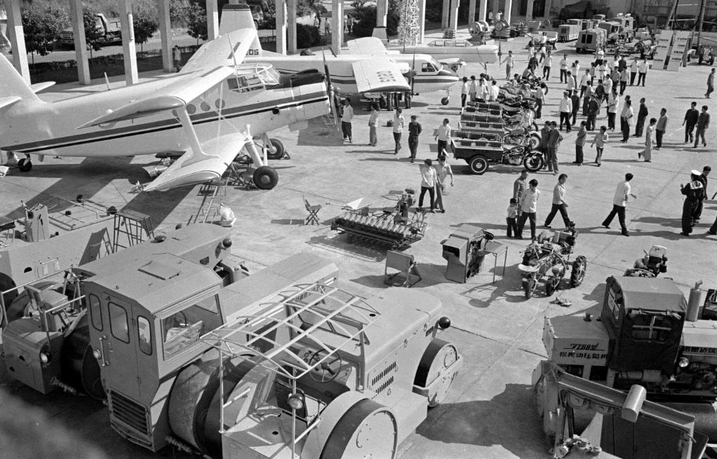 參加1979年秋季中國出口商品交易會的來賓們在廣場上參觀各種農業機械和農用飛機。