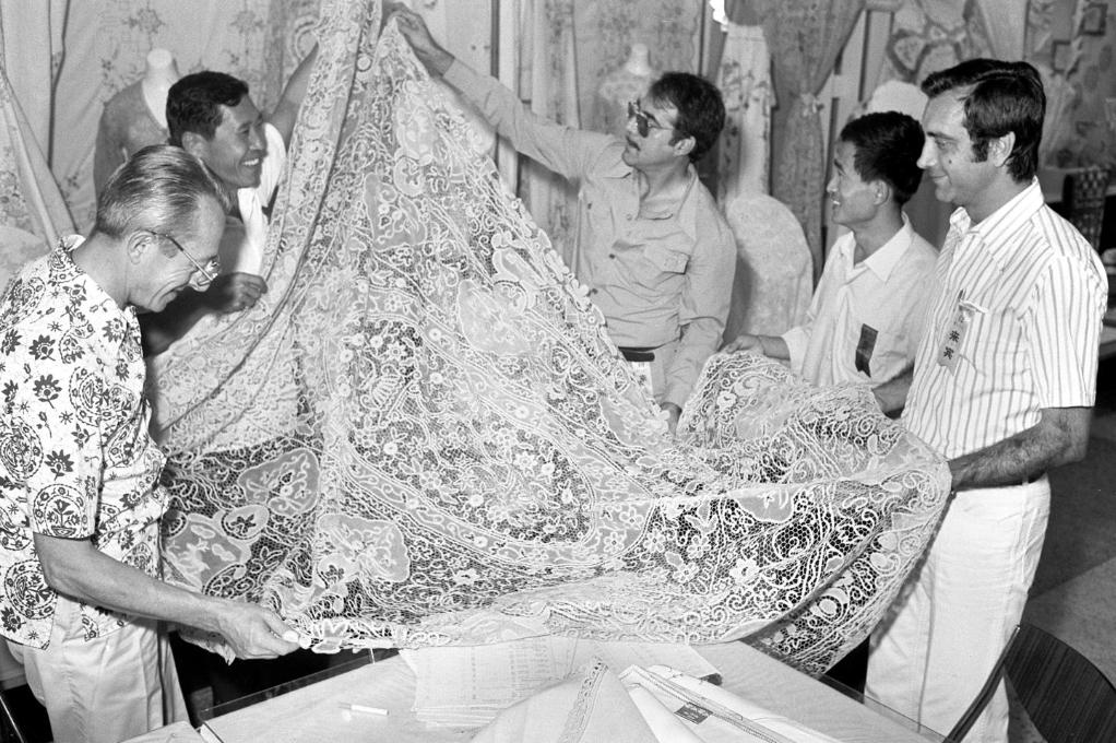 1977年秋季中國出口商品交易會上,西班牙客商選購山東煙臺地區出產的抽紗。抽紗是煙臺地區的傳統手工藝品,花色繁多,質量精美,暢銷世界各地。