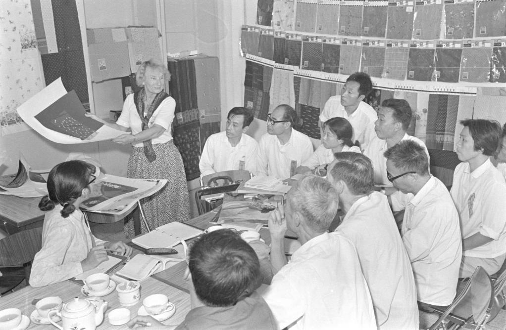 在1978年秋季中國出口商品交易會上,我紡織品交易團工作人員請西德客商介紹西德絲綢花色樣品,以便使出口商品產銷對路。