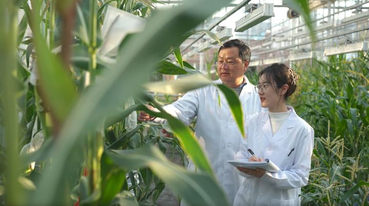 中國農業大學師生在作物功能基因組與分子育種研究中心查看玉米表型。(中國農大供圖)