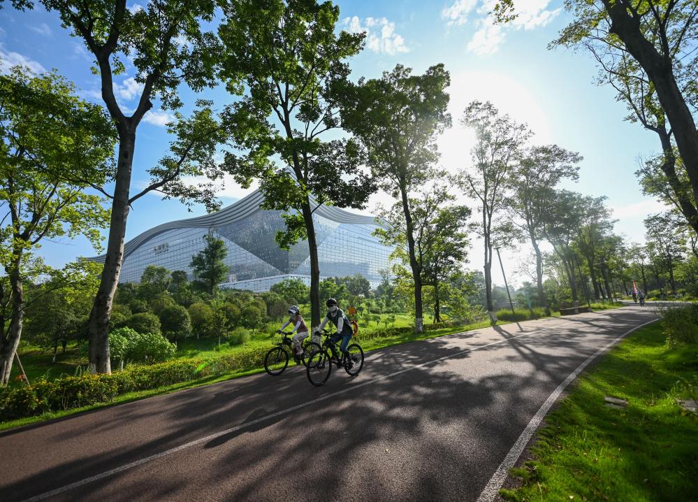 2023年7月16日,人們在成都高新區桂溪生態公園騎行。新華社記者 王曦 攝
