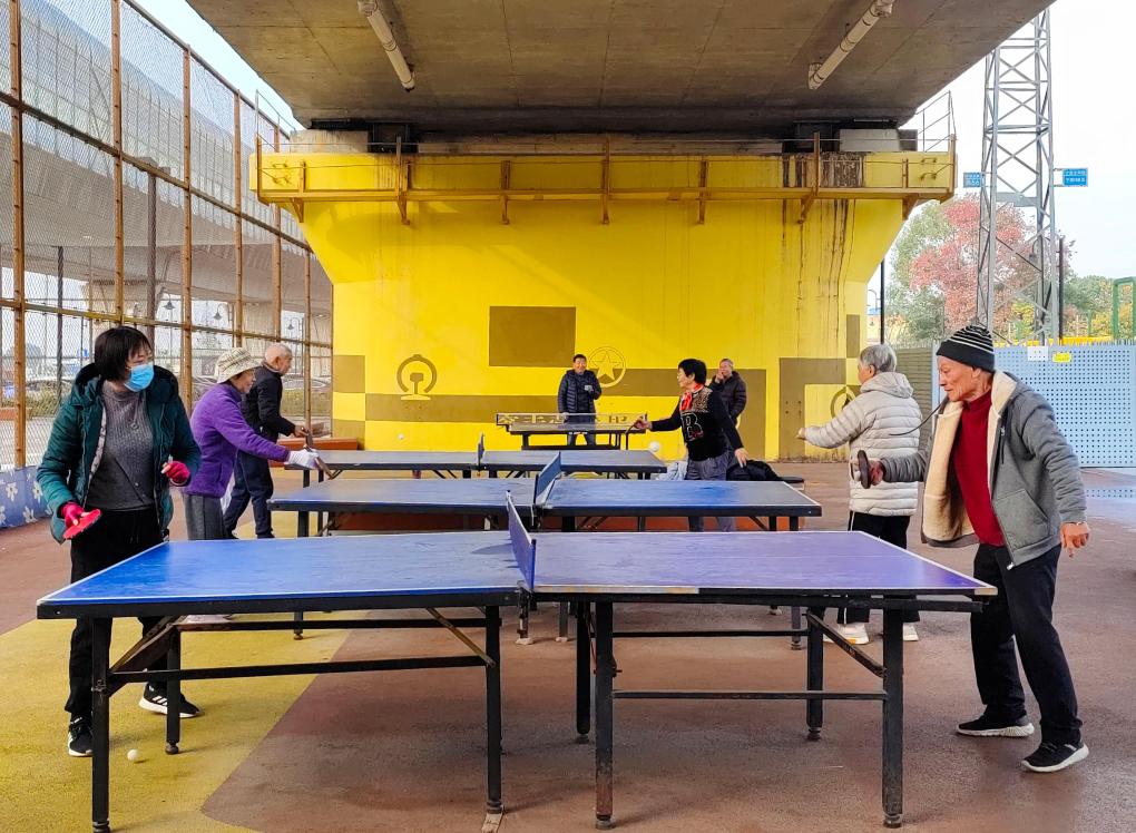 2023年12月5日,在寧波市鄞州區五鄉鎮,老年人在一處橋下運動場打乒乓球。新華社發(胡學軍攝)