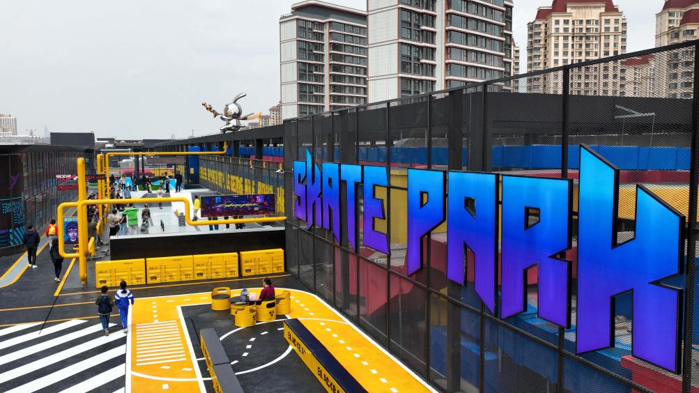 這是2023年4月28日拍攝的天津中海環宇城購物中心樓頂滑板公園(無人機照片)。新華社記者 孫凡越 攝
