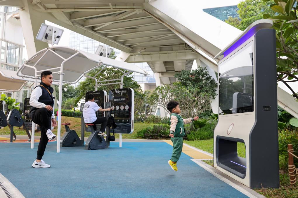 2024年12月27日,在深圳筆架山公園,小朋友和家長一起使用智能互動屏鍛煉身體。新華社記者 梁旭 攝
