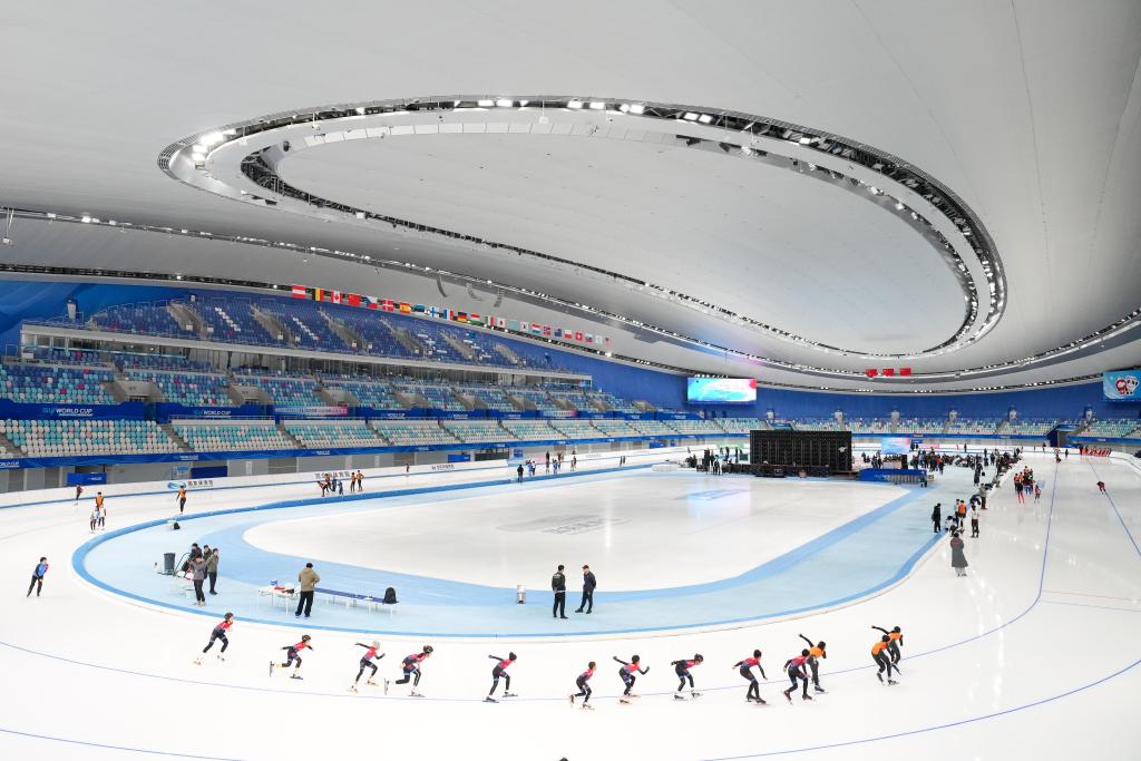 2024年11月23日,在國家速滑館,參加2024年京津冀青少年速度滑冰邀請賽的小選手們在賽前熱身。新華社記者 鞠煥宗 攝