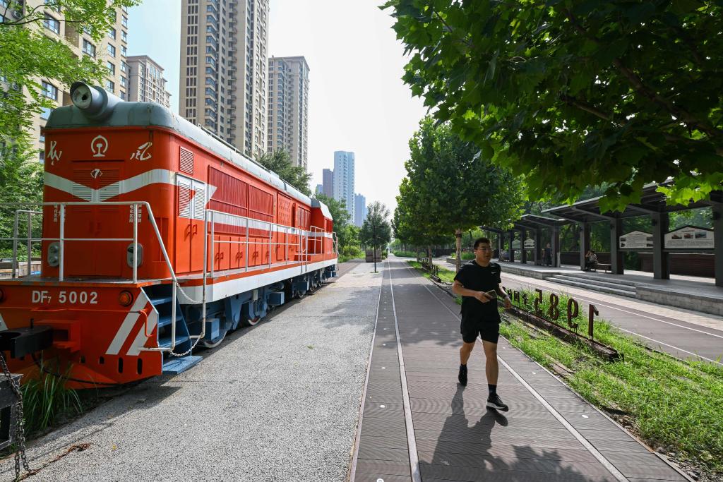 2024年8月8日,市民在天津市城市綠道公園步道上跑步。城市綠道公園原為已停用的津浦(陳塘支線)鐵路,自2019年起分段提升改造,在保留了鐵路元素的同時,增加植被綠化面積和公共體育設施,構建多功能運動健身場所,為市民提供一個開放式的運動主題生態廊道。 新華社記者 孫凡越 攝