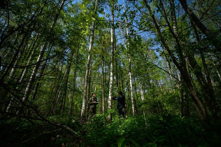 科研工作者在長白山國家級自然保護區的植物固定監測樣地測量記錄樹木生長數據(2024年5月9日攝)。新華社記者 許暢 攝