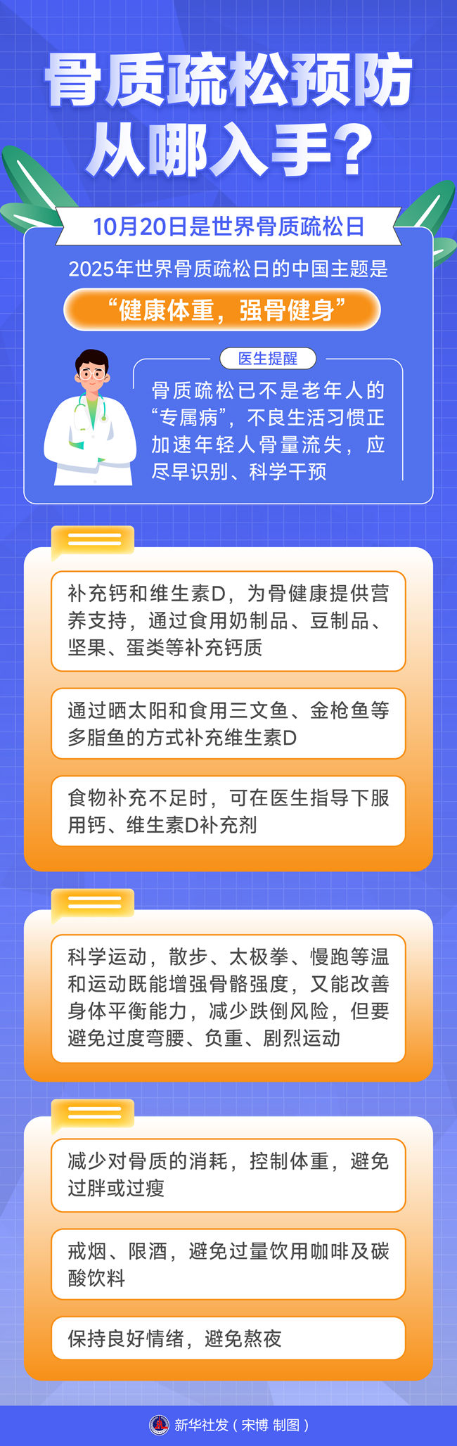 10月20日是世界骨質疏松日。2025年世界骨質疏松日的中國主題是“健康體重,強骨健身”。醫生提醒,骨質疏松已不是老年人的“專屬病”,不良生活習慣正加速年輕人骨量流失,應盡早識別、科學干預。