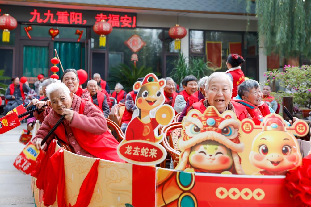 10月28日,在河南省武陟縣木城街道木城養老院,老人們參加 “重陽節趣味劃船”活動。新華社發(王琳鋒 攝)