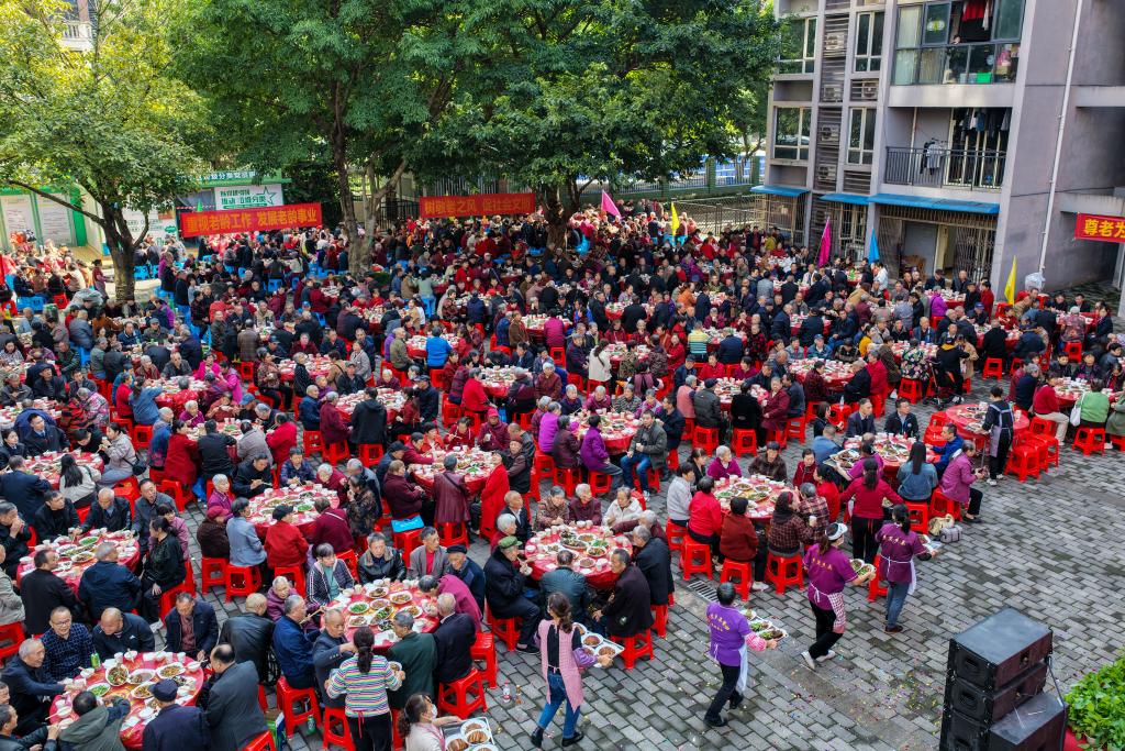 10月28日,重慶市九龍坡區華巖鎮石龍社區開展“九九重陽節 濃濃百家情”主題活動,老人們在“長壽宴”活動現場用餐(無人機照片)。新華社記者 黃偉 攝
