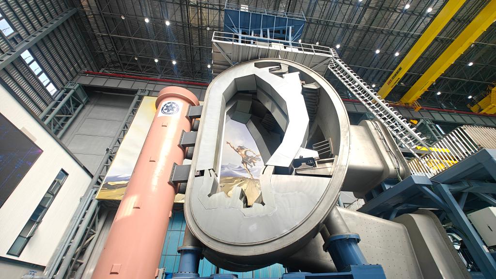 “夸父”園區11號廠房巨型的穹頂下,一個碩大的“橘子瓣”——八分之一真空室靜臥中央。未來,八個“橘子瓣”將精準拼接,構成下一代“人造太陽”的核心艙室?!皬念A研、研制、調試到正式建成并通過驗收,我們歷時十年攻關,形成40余項發明專利?!卑朔种徽婵帐壹翱傮w安裝系統負責人劉志宏自豪地說,最近幾個月,“橘子瓣”旁愈加熱鬧,偏濾器原型件給它裝上超強“盾牌”,遙操作系統測試平臺的機械臂徐徐展開,如夸父伸出巨臂,精準探入裝置內部進行檢測。