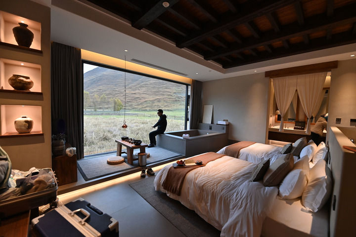2025年10月31日,在四川省甘孜州康定市新都橋鎮,來自浙江的游客在贊巴·明境民宿酒店的房間里休息。新華社記者 肖瀟 攝