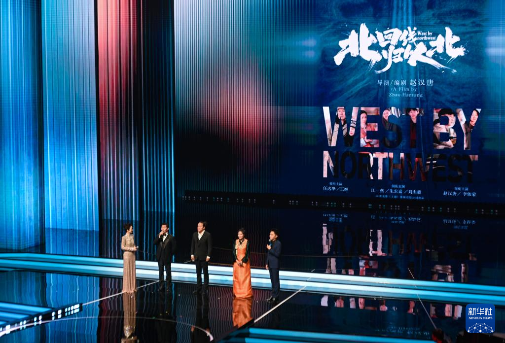 11月11日晚,新片新作《北回歸線以北》主創人員在2025年中國金雞百花電影節開幕式上進行推介。新華社記者 周義 攝