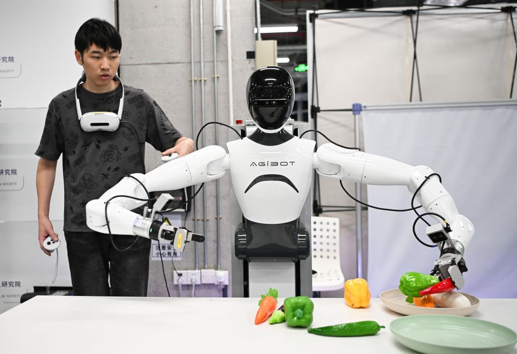 廣東省具身智能機器人創新中心,工作人員操縱機器人同步動作。 新華社記者鄧華 攝