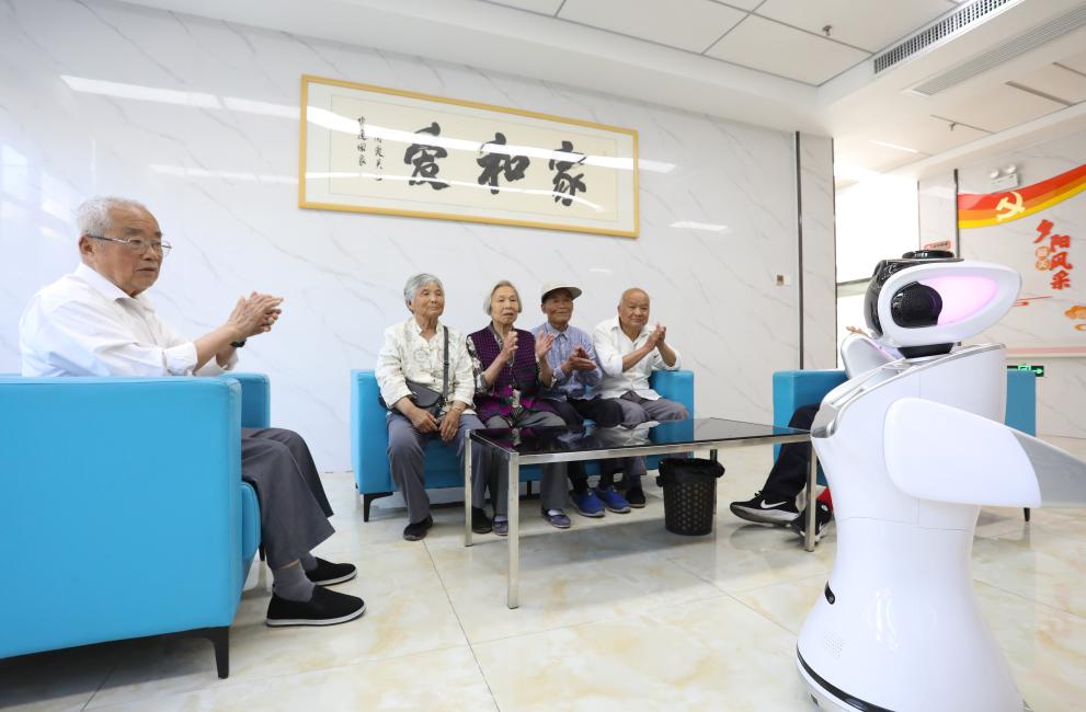 在合肥市肥西縣上派鎮康和社區愛和家綜合性老年活動中心內,智能機器人給老年人播放音樂。新華社發(陳家樂 攝)