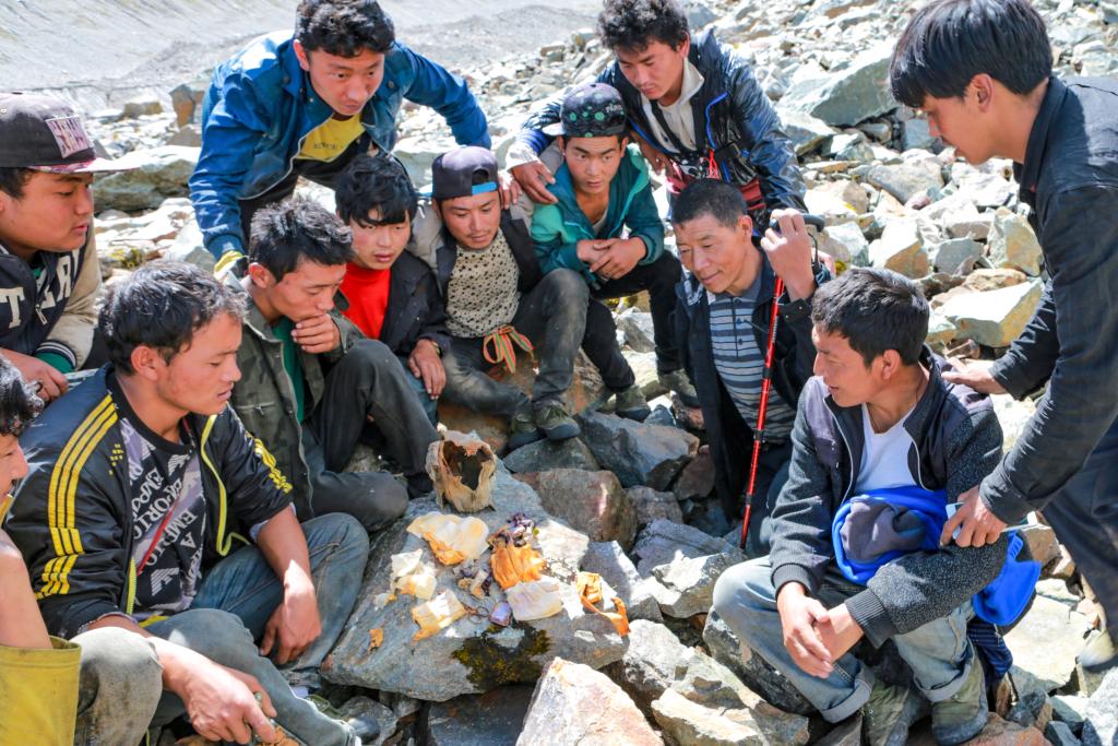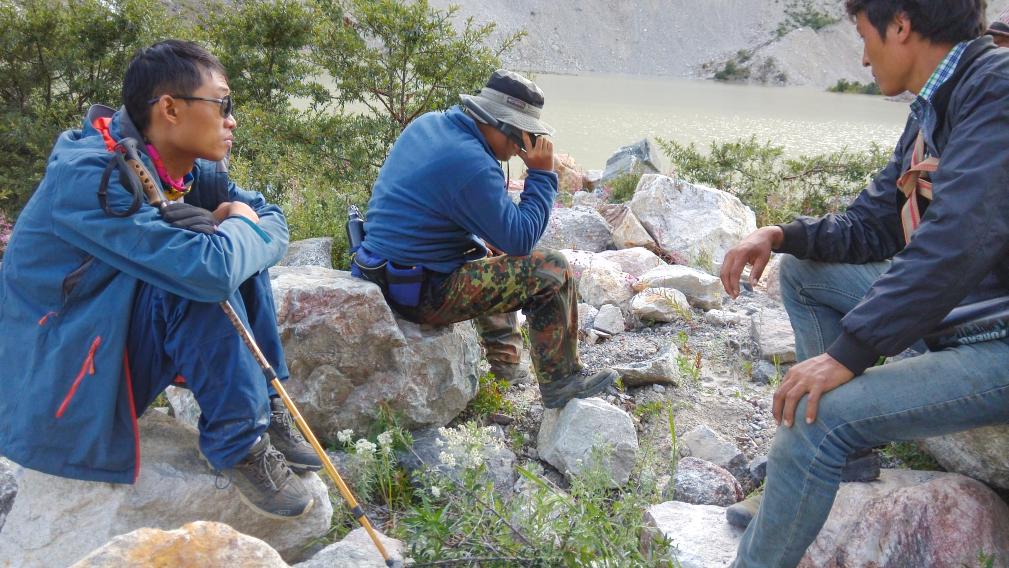大概半個小時后,我找到了倪堅,發現他5個多小時才下撤不到2公里,躺在冰川下湖邊滑坡帶的一塊石頭上,胸悶,渾身無力,幾乎無法動彈。我判斷他可能罹患高原肺水腫,當即通過衛星電話與在山外負責指揮的同事取得聯系,請他們馬上聯絡救援力量。隨后大家商定:當時在場隊員分為兩隊,一隊背負所有文物與輜重,先行趕往營地,再組織人力回援;另一隊由我帶領,在向導羅松的幫助下,指揮5位最強壯的當地志愿者輪流背負倪堅下撤。