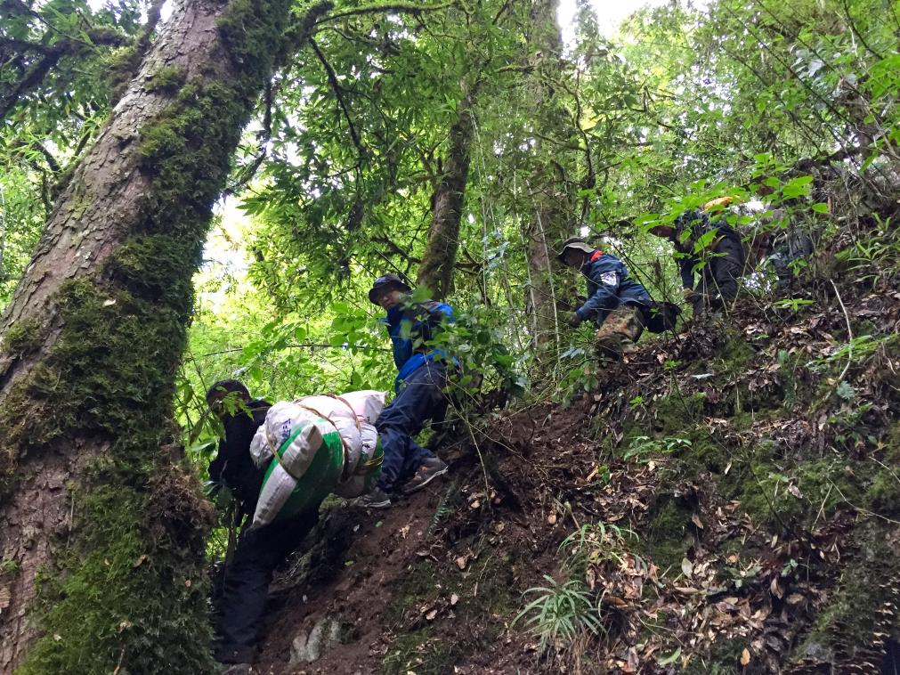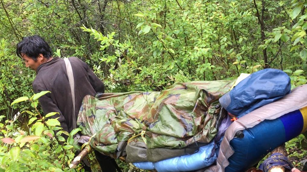 拔營下撤時,情況更壞了。雨下個不停,倪堅已經連說話都沒有力氣了,補給也已不多。此時距離走出大山還有50公里。路上我們得到山外同事的回復:山谷里全是亂流,直升飛機救援完全沒有可能,但波密縣人民醫院的醫生已在進山途中。據此我決定:我、童青松、羅松等13人組成救護團隊,攜帶必備的輜重和所有的給養,采取一切可能的手段,押后護送倪堅出山;其他人攜帶文物,急行軍到預設的補給點加拉巴冬河,盡速出山。