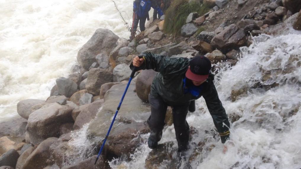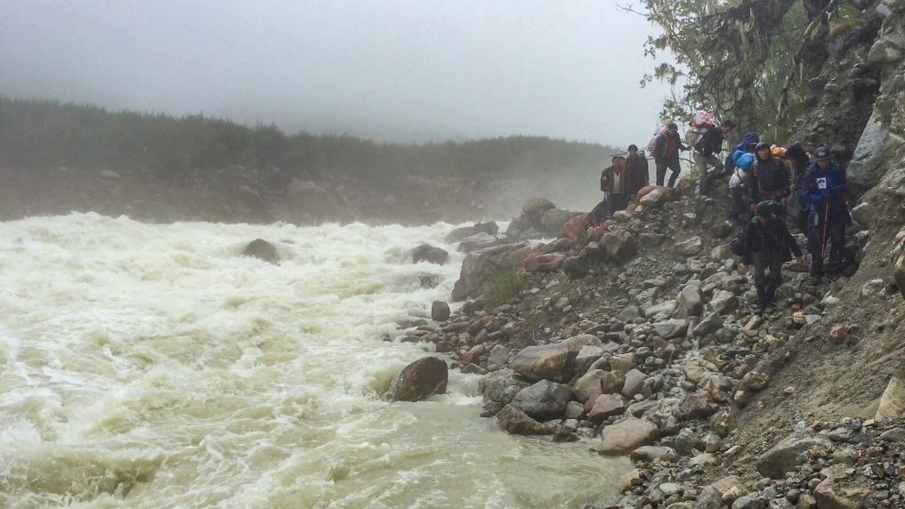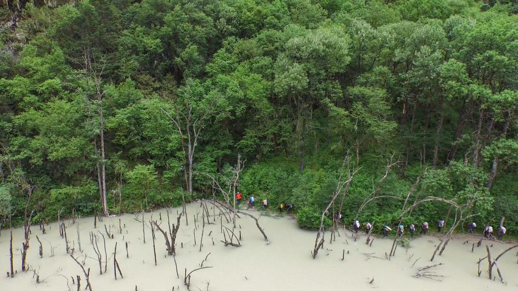 這是一條總長只有10公里,卻漫長到令人絕望的路。湖邊路完全在滑坡帶上,上方是不穩定的碎石帶,下方則是連綿不絕的大石堆,經過一天的奔波,體力已基本被耗盡我們就這樣輪流背著體重80多公斤的同伴在破碎地形上前行……