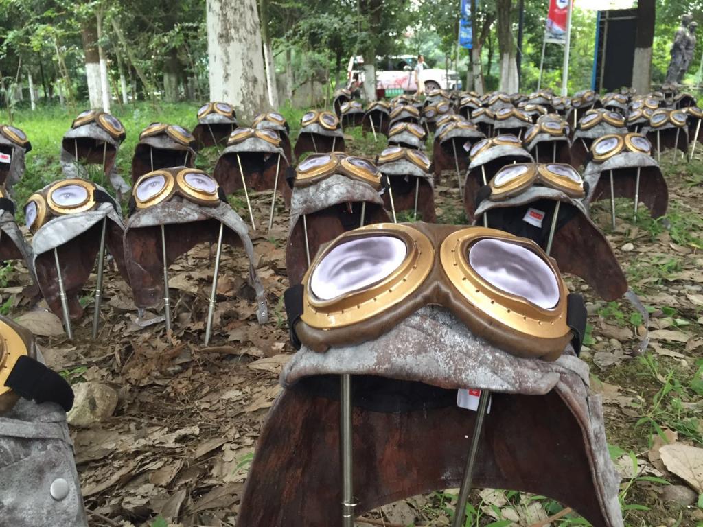 這是2015年8月16日拍攝的《折翼——找尋C-87》大型圖片裝置展中展出的100件飛行員頭盔展品,寓意向“駝峰航線”飛行中犧牲的飛行員致敬。新華社發