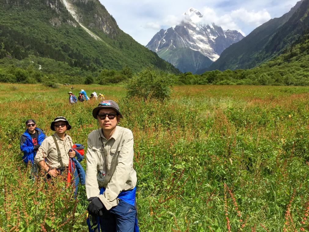 2015年8月2日,姜帆(前中)和搜尋隊成員張瑾(前右)、胡志洋(前左)等在前往若果冰川的路上。 新華社發(李芳宇 攝)