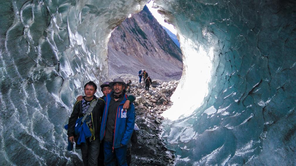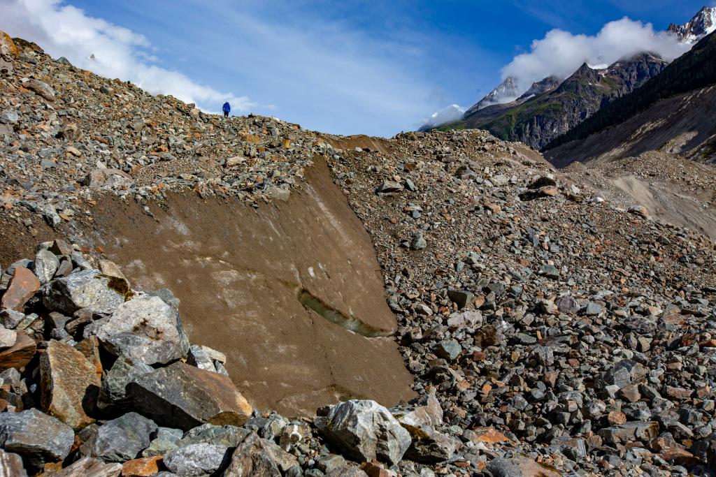 8月5日,徒步進山的第6天,隊伍從營地跋涉8公里后,于上午抵達若果冰川下緣冰磧,從這里再走約6公里的冰磧石頭路就可以抵達墜機地點。但我們不是要翻越山丘,而是要走過亙古不化的冰川上覆蓋著或厚或薄的碎石,每塊石頭都可能移動,比起小石塊來說,看似穩固的大石塊更可能是陷阱……石下是冰,冰下是冰川融水,我們仿佛走在一根巨大的正在融化的“巧克力雪糕”上,步步驚心。