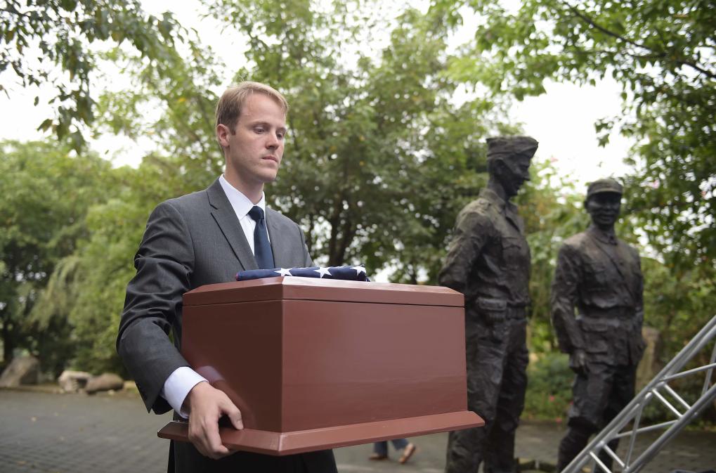 2015年10月22日,“二戰援華美軍骸骨移交儀式”在四川建川博物館舉行,來自美方的代表團把在西藏林芝波密縣易貢鄉若果冰川沉睡72年的“駝峰航線”美國飛行員遺骸接回家,圖為美方工作人員懷抱“駝峰航線”美軍骸骨盒。 新華社記者 薛玉斌 攝