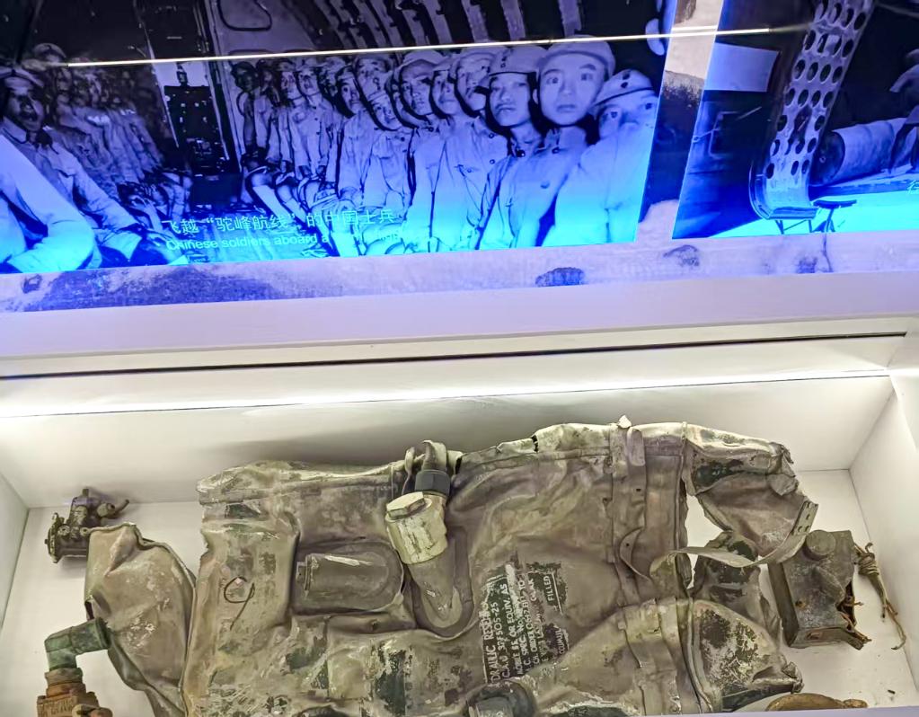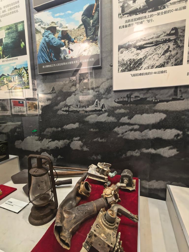這是建川博物館收藏展覽的一件來自若果冰川的C-87墜機殘骸,背景圖片名為《飛越“駝峰航線”的中國士兵》(2025年11月6日攝)。 (建川博物館供圖)