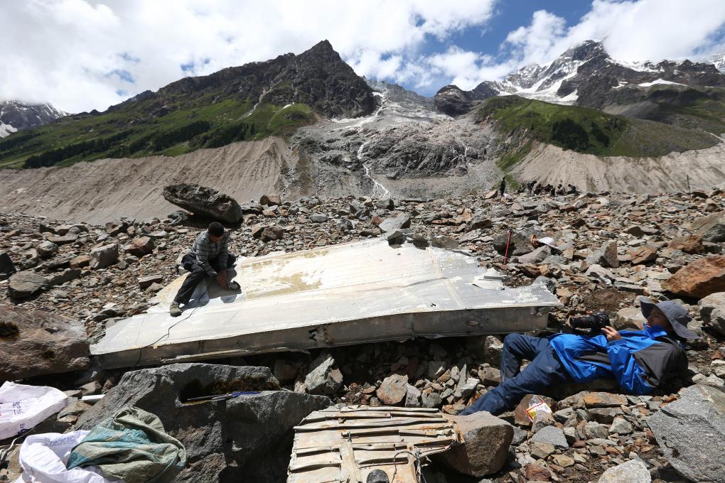 2015年8月5日,搜尋隊在若果冰川上檢查部分墜機遺物。 新華社發(李芳宇 攝)