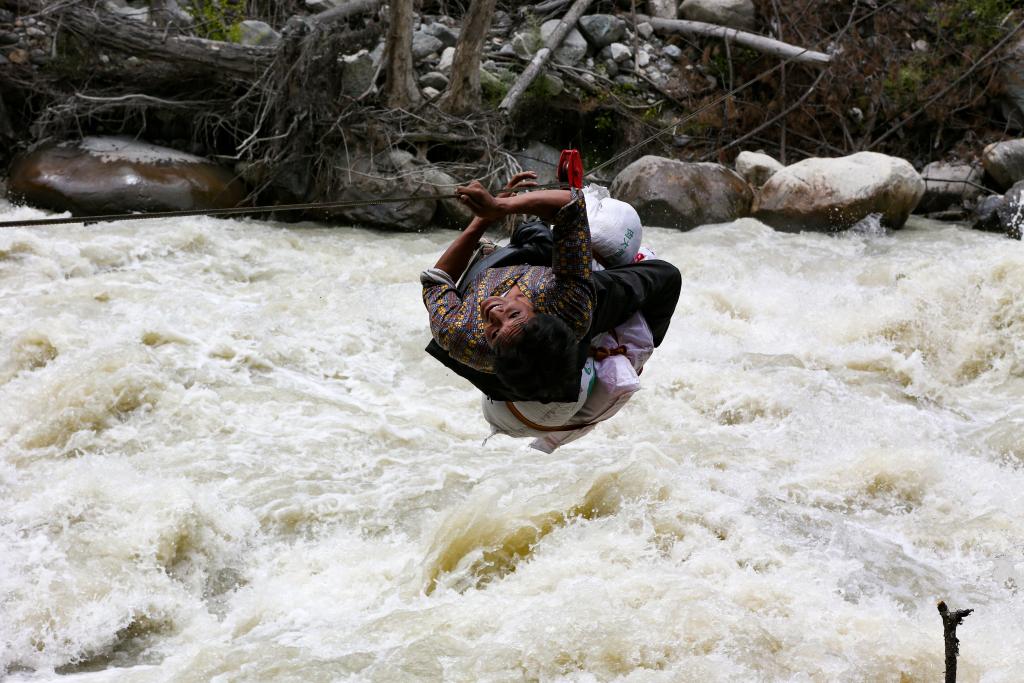 2015年7月31日,搜尋隊在前往若果冰川的路上用滑索過河。
