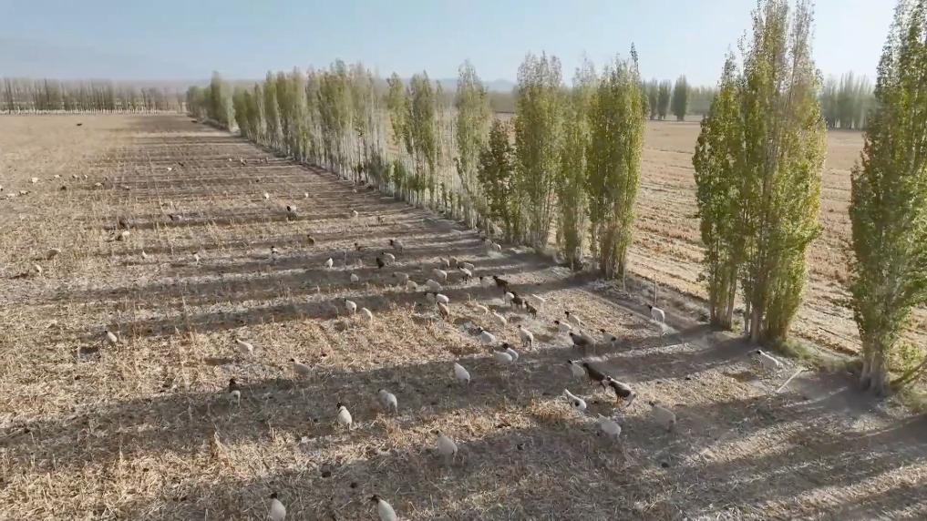 在新疆和碩縣,隨著農田作物采收逐步完成,殘留秸稈地里迎來了一批批新的“食客”。