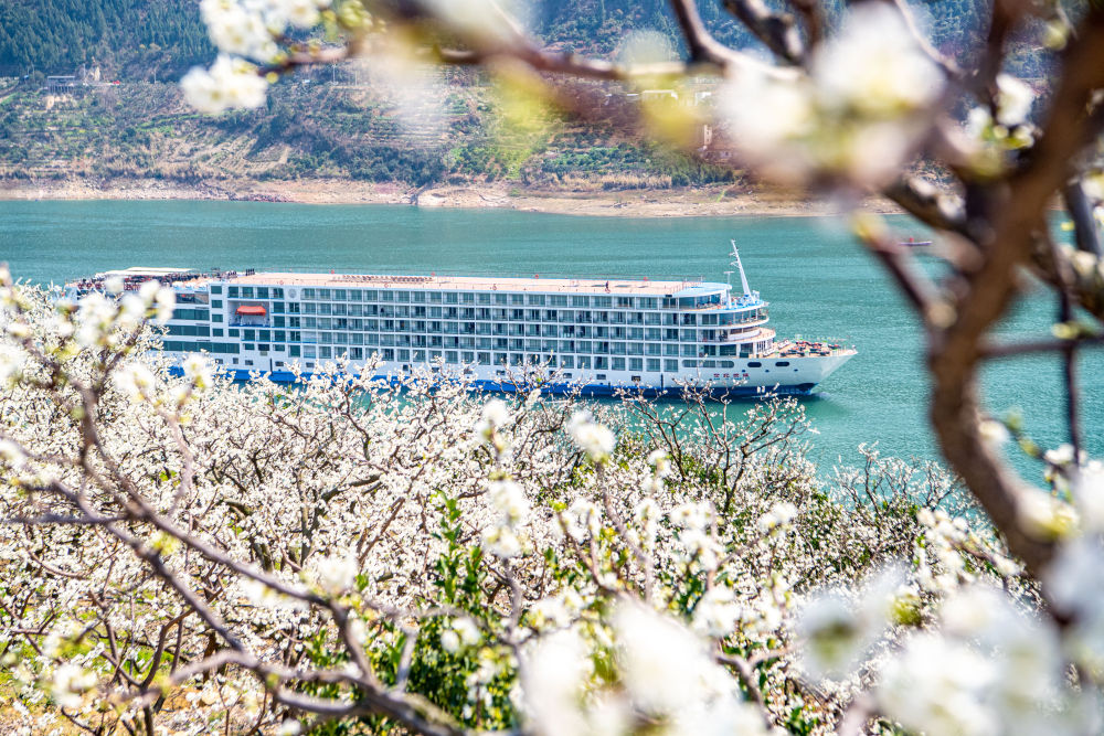 這是2025年3月21日拍攝的重慶市巫山縣曲尺鄉長江兩岸的萬畝李花。新華社記者 唐奕 攝