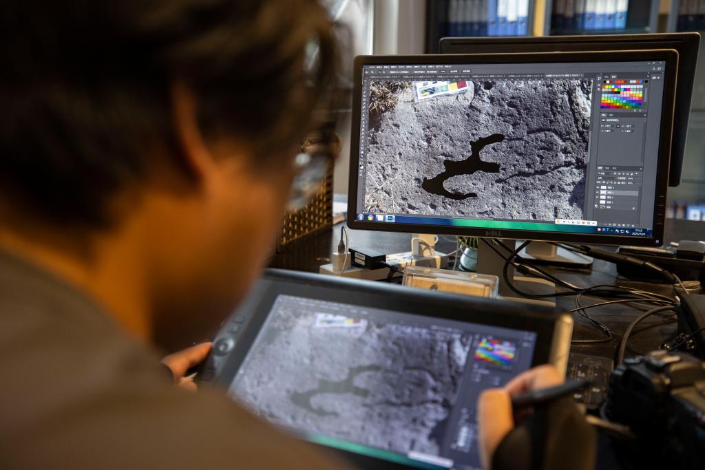 2025年7月23日,工作人員在繪制賀蘭山巖畫電子線描圖。新華社記者 楊植森 攝