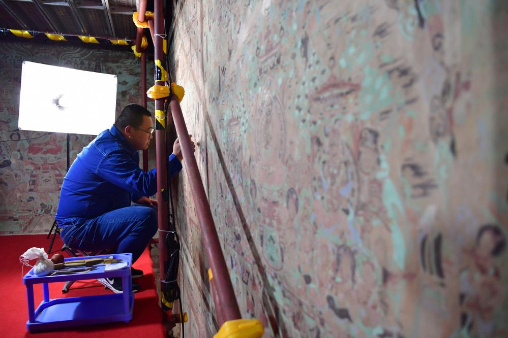 2022年4月19日,敦煌研究院文物保護技術服務中心壁畫修復師在修復出現病害的壁畫。新華社記者 陳斌 攝