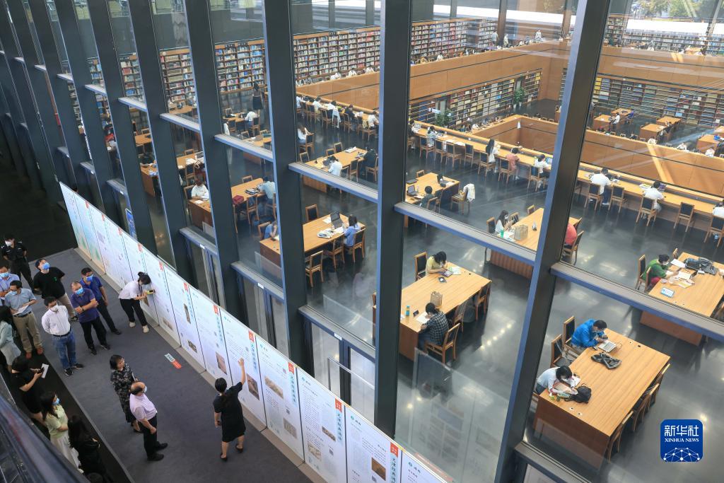在北京國家圖書館,工作人員介紹“經典,予生活以詩意——‘文津經典誦讀’十周年主題展”(2022年9月7日攝)。新華社記者 殷剛 攝